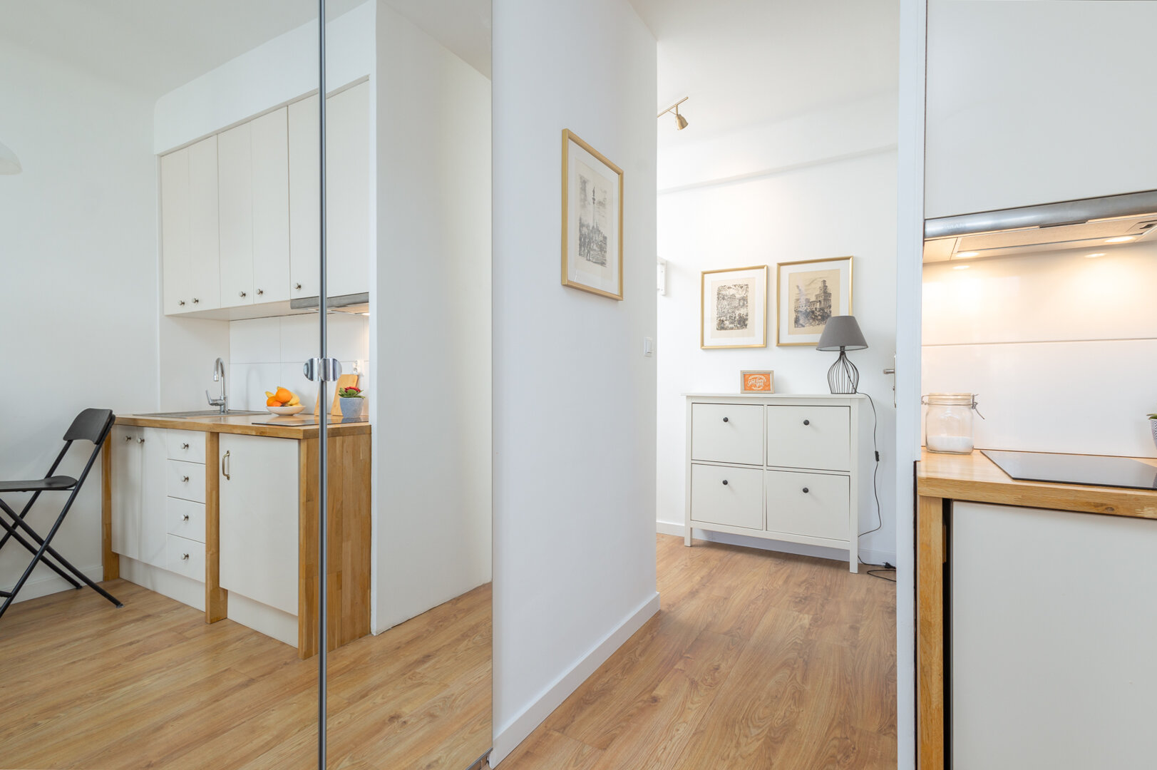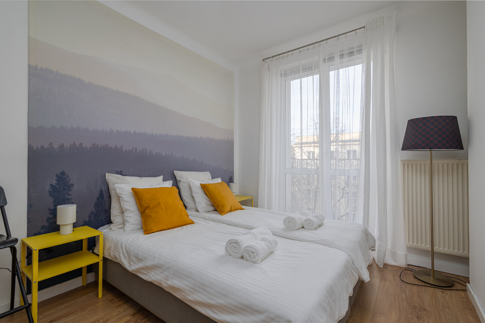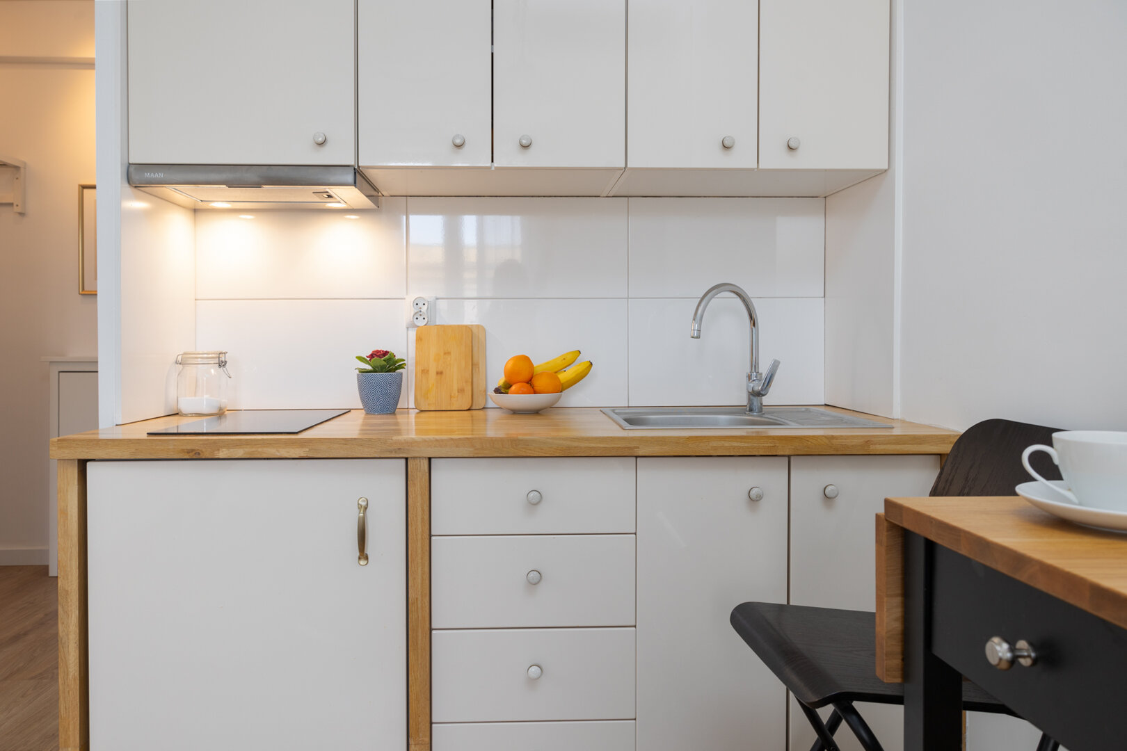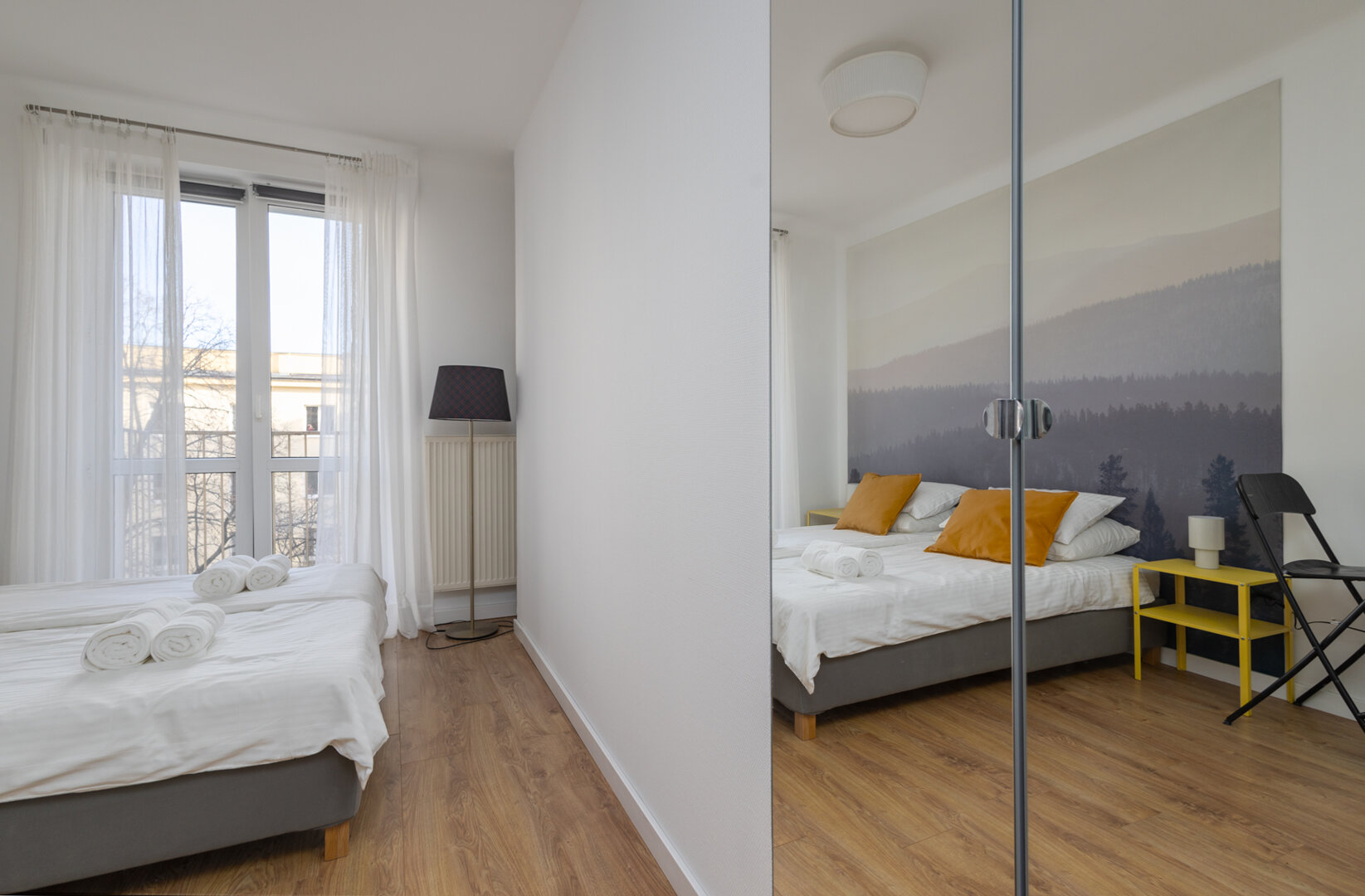 Apartament posiada część sypialną z telewizorem (opcjonalnie), szafę wnękową oraz łazienkę. Aneks kuchenny wyposażony jest w płytę indukcyjną, okap oraz przybory kuchenne. Goście mogą korzystać z zestawu do parzenia kawy i herbaty, podziwiając widok na miasto z dedykowanej strefy przy oknie.