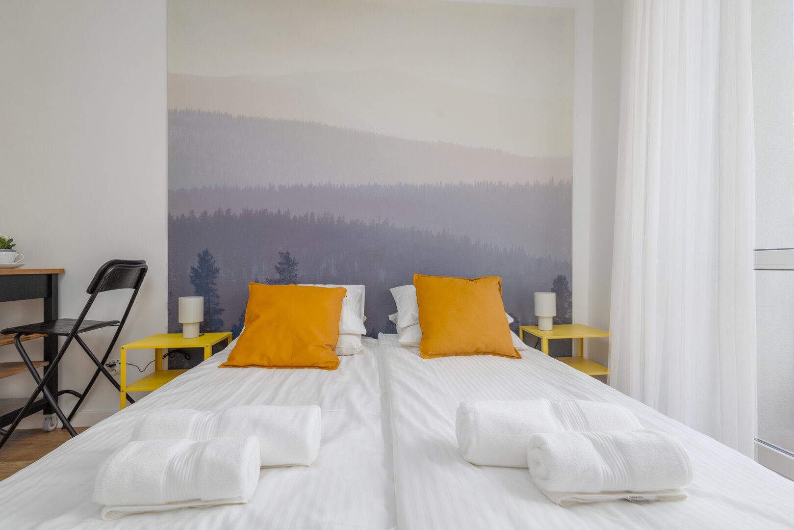 Strefa Sypialniana: Centralnym punktem jest wygodne łóżko (z możliwością rozdzielenia na dwa pojedyncze), ozdobione charakterystycznymi musztardowymi poduszkami. Ścianę za łóżkiem zdobi nastrojowa fototapeta z motywem lasu we mgle, która nadaje wnętrzu głębi i spokoju.