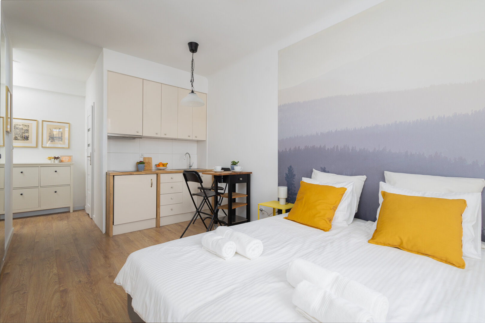 Strefa Sypialniana: Centralnym punktem jest wygodne łóżko (z możliwością rozdzielenia na dwa pojedyncze), ozdobione charakterystycznymi musztardowymi poduszkami. Ścianę za łóżkiem zdobi nastrojowa fototapeta z motywem lasu we mgle, która nadaje wnętrzu głębi i spokoju.
