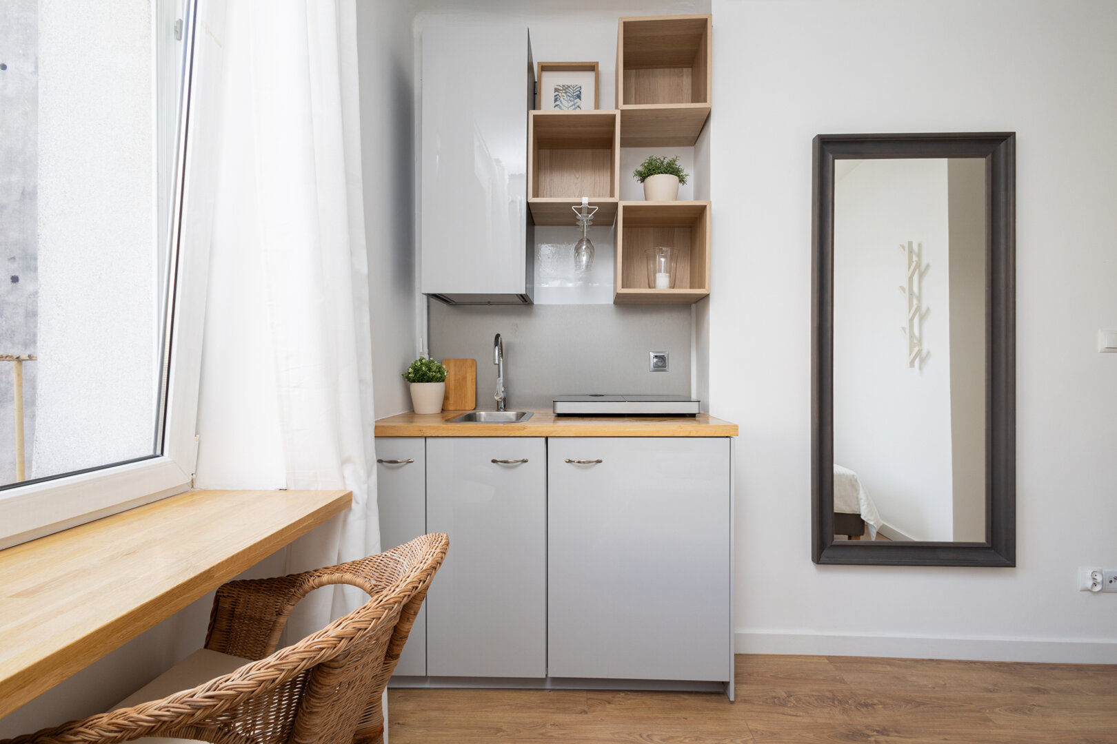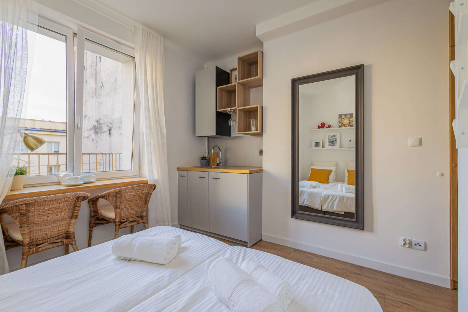 Apartament posiada część sypialną z telewizorem (opcjonalnie), szafę wnękową oraz łazienkę. Aneks kuchenny wyposażony jest w płytę indukcyjną, okap oraz przybory kuchenne. Goście mogą korzystać z zestawu do parzenia kawy i herbaty, podziwiając widok na miasto z dedykowanej strefy przy oknie.