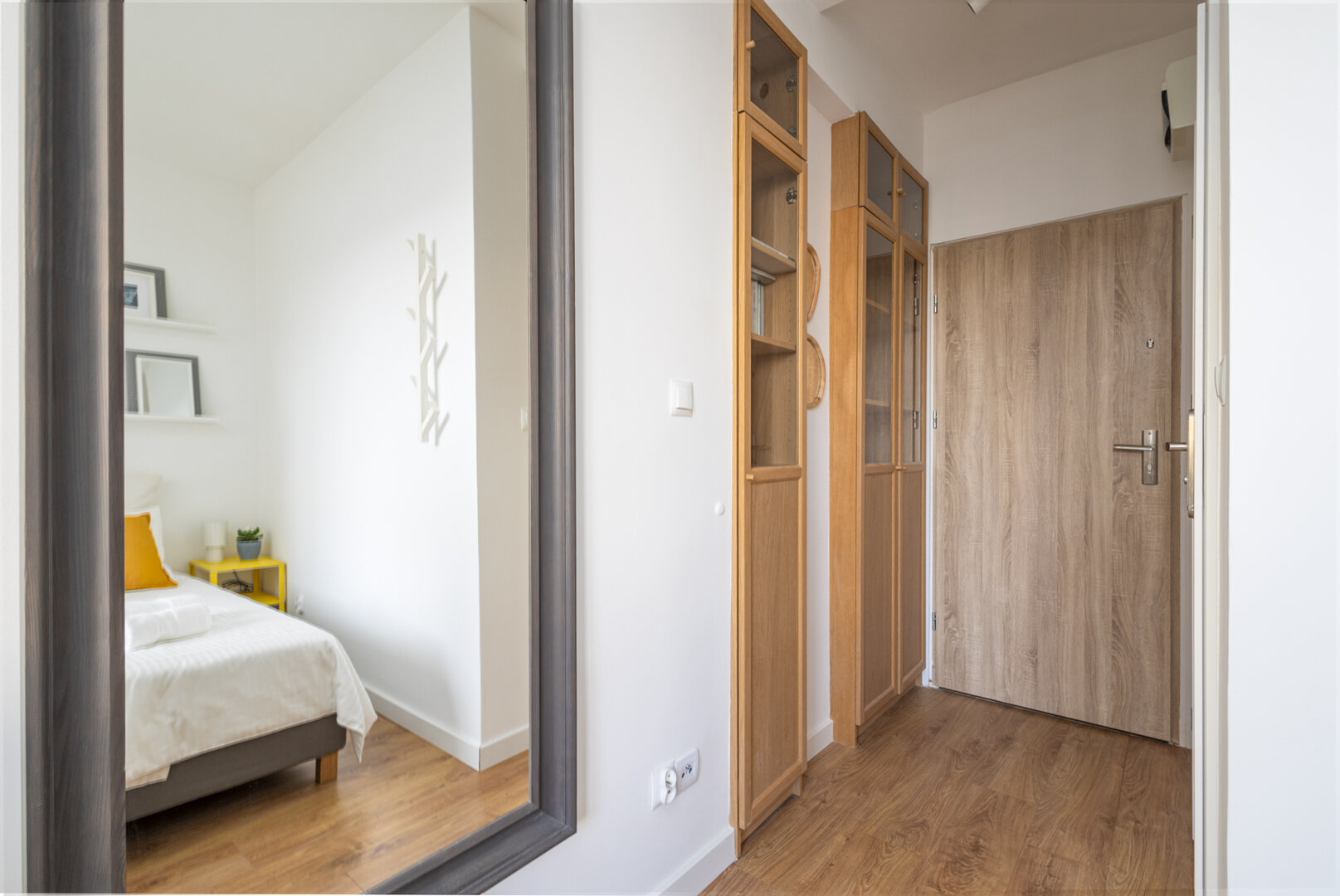 Przechowywanie: W korytarzu znajduje się wysoka, przeszklona zabudowa meblowa, zapewniająca dużo miejsca na rzeczy osobiste.