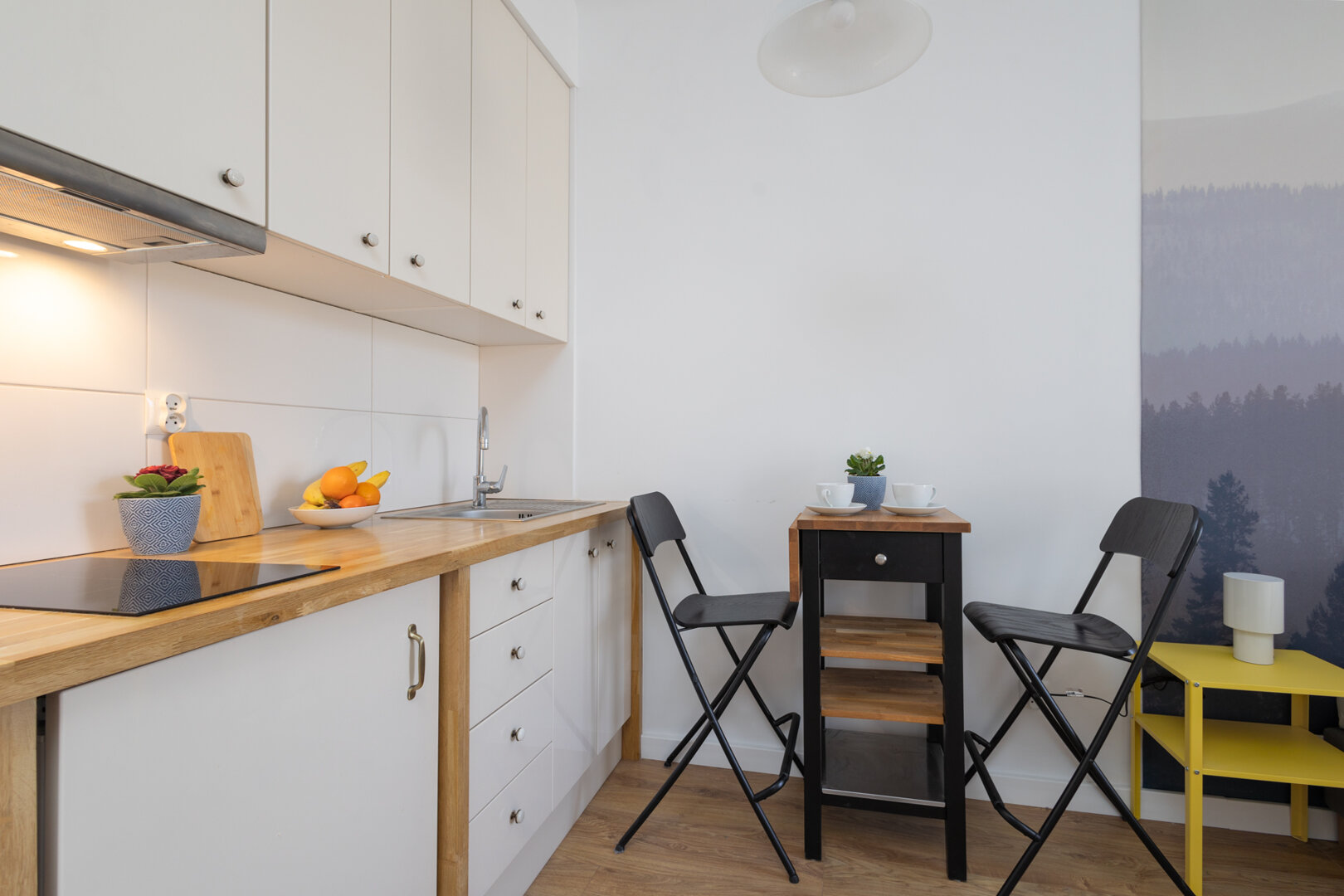 Kolorystyka: Dominująca biel i jasne drewno zostały przełamane energetycznym żółtym kolorem oraz głębokim granatem fototapety, co tworzy spójną i nowoczesną całość.